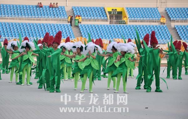 當(dāng)日16時30分許,伴隨著悠揚的鐘聲,文體表演第一章“龍騰歡歌”拉開序幕,幾百名身著盛裝,手拿花環(huán)、紅綢的演員從4個方向快速向市體育場中心表演場地飛奔而去,在音樂聲中盡情舞蹈。表演隊伍中最吸引觀眾眼球的是一群身穿泥泥狗造型服裝的演員,他們獨特的表演十分引人注目。同樣出現(xiàn)在演出現(xiàn)場的還有擔(dān)經(jīng)挑、旱船、竹馬等反映周口獨特文化資源的文化元素,這些無疑成了第一章的最大亮點。