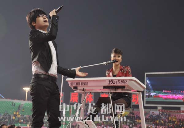 就在觀眾意猶未盡之時,著名演唱組合“玖月奇跡”突然出現(xiàn)在表演場地上,引起觀眾一陣騷動。“玖月奇跡”的女成員王小瑋在專用樂器“雙排鍵”上手腳并用,演奏出優(yōu)美樂曲的同時,男歌手王小海飆起了高音,震驚全場,把現(xiàn)場氣氛又一次推向高潮。