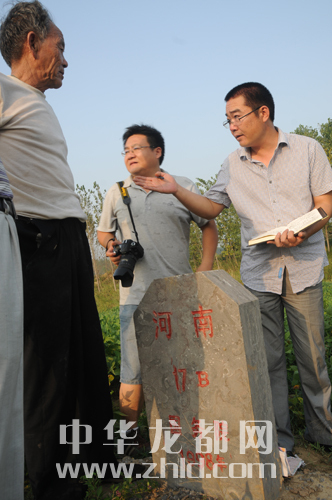 ????地圖上顯示,沿清水河往南,立有豫皖兩省的界碑。豫皖邊界線全長(zhǎng)366.27公里,不僅是周口與安徽的交界,也是河南與安徽的交界。由于河岸西邊沒(méi)有往南的道路,采訪組決定過(guò)橋到安徽境內(nèi)南行。對(duì)岸是亳州市雙溝鎮(zhèn),采訪車一路顛簸,沿清水河南下,途經(jīng)一座正在施工的小橋時(shí),采訪車幾乎是從河床底下硬“爬”上去的,一路險(xiǎn)象環(huán)生。好在江鈴越野車動(dòng)力十足,才順利走完了這段“無(wú)路之路”。而真正尋找界碑的路才剛剛開始,一段行程后,采訪車到了一個(gè)叫王河口的村莊,這是白馬鎮(zhèn)最東邊的一個(gè)村子。70歲的村民王士林自告奮勇,愿意帶記者去找界碑?!?998年埋界碑時(shí),我去過(guò),就在俺村最南邊的河岸上,周圍都是莊稼地,咱去找找看吧,車過(guò)不去?!蓖跏苛诌呑哌呎f(shuō)。記者一行尾隨其后,在莊稼地里徒步約1公里,四處查找,終于看到了此次采訪活動(dòng)的第一塊界碑。碑文顯示:“河南17B 國(guó)務(wù)院1998年”?;蛟S是出于興奮、激動(dòng)、新鮮、好奇,一路勞頓竟蕩然無(wú)存。