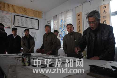 ????作為距離太康縣城最遠的一個邊界鄉(xiāng)鎮(zhèn),轉(zhuǎn)樓鄉(xiāng)的文化活動開展得有聲有色。該鄉(xiāng)依托文化站,成立了在鄉(xiāng)一級少見的文聯(lián),下設(shè)書法家協(xié)會、腰鼓協(xié)會、嗩吶協(xié)會等。我們在轉(zhuǎn)樓鄉(xiāng)政府采訪時,正碰上書法家協(xié)會20多名會員在一起切磋書藝。今年74歲的許家榮是鄉(xiāng)書法家協(xié)會主席,也是《周口晚報》的老讀者,看到我們到來,老人興之所至,當場揮毫潑墨,為本報題寫了“周口邊界行接地氣有人氣”的條幅。據(jù)了解,每逢春節(jié),書法家協(xié)會會員都會走村串戶,為村民義務(wù)書寫春聯(lián)。
