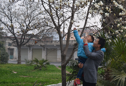 ????春風(fēng)送暖,各種花次第開(kāi)放,引得市民爭(zhēng)相品味醉人的春色。圖為昨日扶溝縣一對(duì)父子在觀賞盛開(kāi)的木蘭花。扶溝縣大力開(kāi)展生態(tài)林業(yè)建設(shè),營(yíng)造良好的人居環(huán)境。春天一到,鮮花斗艷,春草吐綠,處處春色醉人。(記者 王泉林 攝)