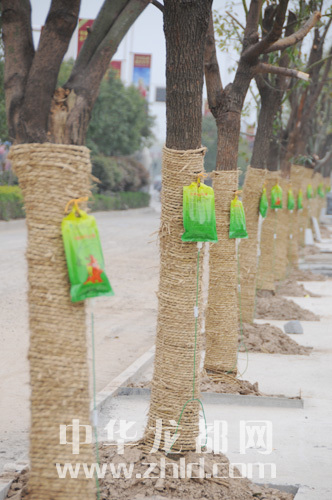 行道樹集體“打點(diǎn)滴”,是生病了,還是有別的原因?當(dāng)日上午,記者來到周口大道與慶豐路交叉口,看到路旁幾十棵新種植的小樹全部掛上了綠色吊瓶(如圖),上面寫著“大樹AG營養(yǎng)針液”。綠化工人在樹干上鉆一個小洞,然后把營養(yǎng)液的軟管放在里邊。扎針、綁膠帶、調(diào)節(jié)輸液器,小樹像極了病人。