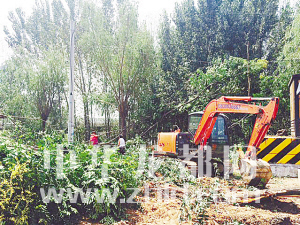 8月22日10時(shí),記者在大慶路橋北西側(cè)的濱河路上看到,市園林處的工作人員在平整場(chǎng)地、清除雜草、移栽苗木。