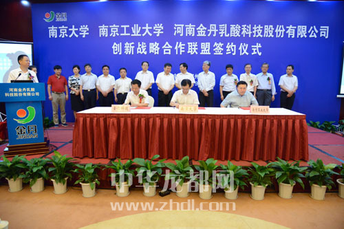????本報(bào)訊(記者 李莉) 7月9日上午,南京大學(xué)、南京工業(yè)大學(xué)、河南金丹乳酸科技股份有限公司創(chuàng)新戰(zhàn)略合作聯(lián)盟簽約儀式在鄭州舉行。副省長(zhǎng)張維寧,中國(guó)工程院院士張全興,南京大學(xué)副校長(zhǎng)談?wù)苊?,南京工業(yè)大學(xué)副校長(zhǎng)喬旭,省科技廳廳長(zhǎng)張震宇,市委書記、市人大常委會(huì)主任徐光,省環(huán)保廳副廳長(zhǎng)師偉,市委常委、常務(wù)副市長(zhǎng)劉保倉,市委常委、組織部長(zhǎng)靳磊,副市長(zhǎng)王田業(yè),及鄲城縣主要領(lǐng)導(dǎo)、河南金丹乳酸公司主要負(fù)責(zé)人出席簽約儀式。