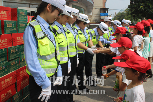 ????當(dāng)前,創(chuàng)建省級(jí)文明城市工作正在周口中心城區(qū)廣泛開展,整個(gè)城市越來越干凈美麗,城市文明程度不斷提升。8月15日上午,在八一大道和七一路交叉口,團(tuán)市委組織數(shù)十名志愿者和孩子協(xié)助交警維護(hù)交通秩序??吹浇痪⒁虩岬煤沽鳑驯常⒆觽兗娂妼⒌V泉水送到她們手中。晚報(bào)記者 王凱 攝