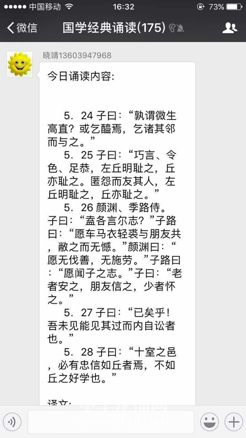 ????建立該微信群的是團(tuán)市委工作人員劉曉靖。劉曉靖告訴周口晚報(bào)記者,建立該微信群的目的是想讓大家多讀讀國學(xué)經(jīng)典,增加大家的文學(xué)涵養(yǎng),讓大家養(yǎng)成讀書的習(xí)慣?!皠傞_始只有十幾個(gè)人,大家有些不好意思,有的人覺得自己讀得不好張不開口,我就做一些示范,引領(lǐng)大家誦讀。不久,加入微信群的人多了,通過幾個(gè)人帶動(dòng),大家誦讀的就多了?!眲跃刚f,讀的方式就是大家通過微信的語音功能,讀一些《論語》中的經(jīng)典句子。過了一段時(shí)間,大家對這種方式越來越認(rèn)可,加入該微信群的人也越來越多,人數(shù)從剛開始的十幾個(gè)人增加到近200人。現(xiàn)在,該微信群里不但有電臺(tái)、電視臺(tái)的專業(yè)主持人,而且有一些學(xué)者。以前拿不準(zhǔn)的字,現(xiàn)在都會(huì)有人講解,大家也有了學(xué)習(xí)對象。這個(gè)微信群從成立到現(xiàn)在,《弟子規(guī)》、《大學(xué)》、《中庸》、《論語》已讀一遍,四書里面只剩下《孟子》還沒有讀。