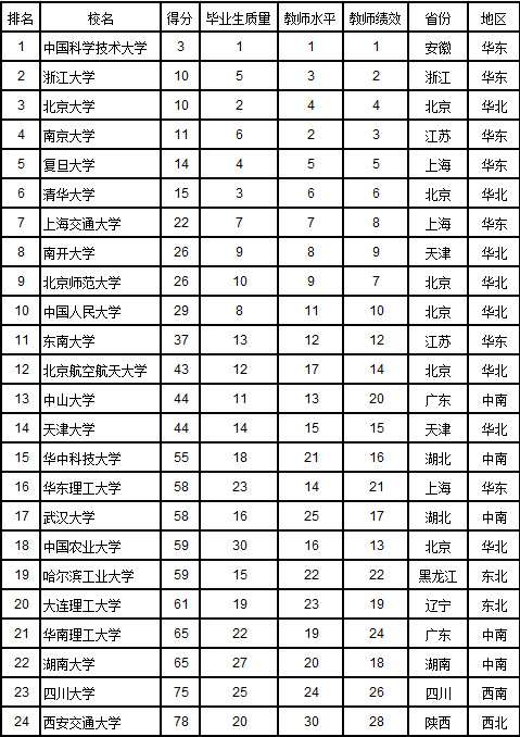 將滿足上述3項條件的大學(xué)的3項排名名次相加后升序排列,得分越低越好。得分相同,教師平均學(xué)術(shù)水平高的大學(xué)居前。