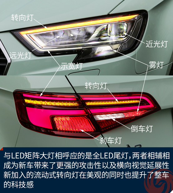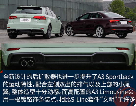 全新設(shè)計(jì)的后擴(kuò)散器也進(jìn)一步提升了A3 Sportback的運(yùn)動(dòng)特性,配合左側(cè)雙出的排氣以及上部的小尾翼,整體造型十分動(dòng)感。而高配置的A3 Limousine會用一根鍍鉻飾條裝點(diǎn),相比S-Line套件“文明”了許多。與LED矩陣大燈相呼應(yīng)的是全LED尾燈,兩者相輔相成為新車帶來了更強(qiáng)的攻擊性以及橫向視覺延展性,新加入的流動(dòng)式轉(zhuǎn)向燈在美觀的同時(shí)也提升了整車的科技感。