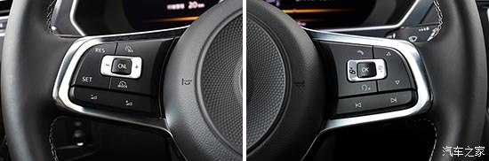三輻式真皮方向盤造型與國(guó)產(chǎn)版本存在一定差異,中間部分采用圓形設(shè)計(jì),且邊緣鑲嵌帶有R-Line標(biāo)識(shí)的銀色飾條,視覺效果更加動(dòng)感、精致。方向盤圈輻偏細(xì),好在真皮材質(zhì)較為細(xì)膩,握感更趨向舒適,而下方采用平底造型,能夠?yàn)轳{駛員營(yíng)造更充足的腿部空間。除了常見的音量調(diào)節(jié)和行車電腦切換等功能外,背面還帶有換擋撥片,“不幸”的是,Tiguan的變速箱天資聰慧,用到它的幾率比較有限。