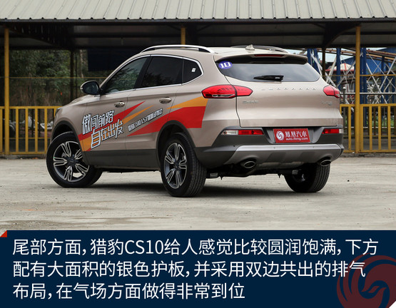 側(cè)面看過去,獵豹CS10采用一條剛勁十足的腰線從頭燈到尾燈,展現(xiàn)出了蓄勢(shì)待發(fā)的車身姿態(tài),同時(shí)鍍鉻窗框亮條的使用讓該車看上去更加豪華大氣。尾部方面,獵豹CS10給人感覺比較圓潤(rùn)飽滿,下方配有大面積的銀色護(hù)板,并采用雙邊共出的排氣布局,在氣場(chǎng)方面做得非常到位。