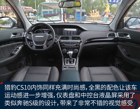 獵豹CS10內(nèi)飾同樣充滿時(shí)尚感,全黑的配色讓CS10的運(yùn)動(dòng)感進(jìn)一步增強(qiáng),儀表盤和中控臺(tái)液晶屏采用了類似奔馳S級(jí)車型的貫通式設(shè)計(jì),帶來(lái)了非常不錯(cuò)的視覺感受。用料方面,中控臺(tái)上方面板為搪塑工藝,手感較軟,并且還進(jìn)行了仿縫線處理,讓整個(gè)內(nèi)飾看起來(lái)很有質(zhì)感。