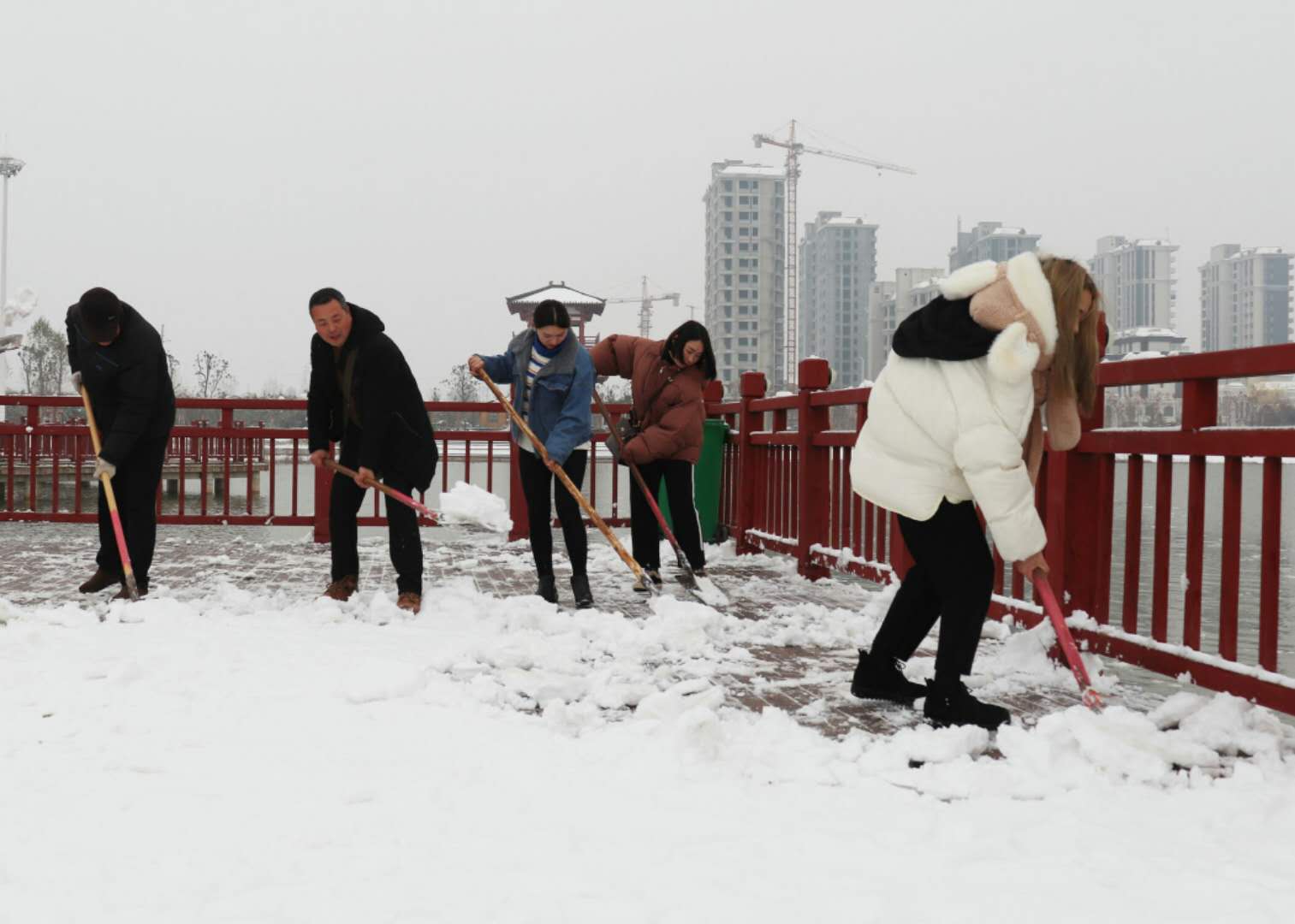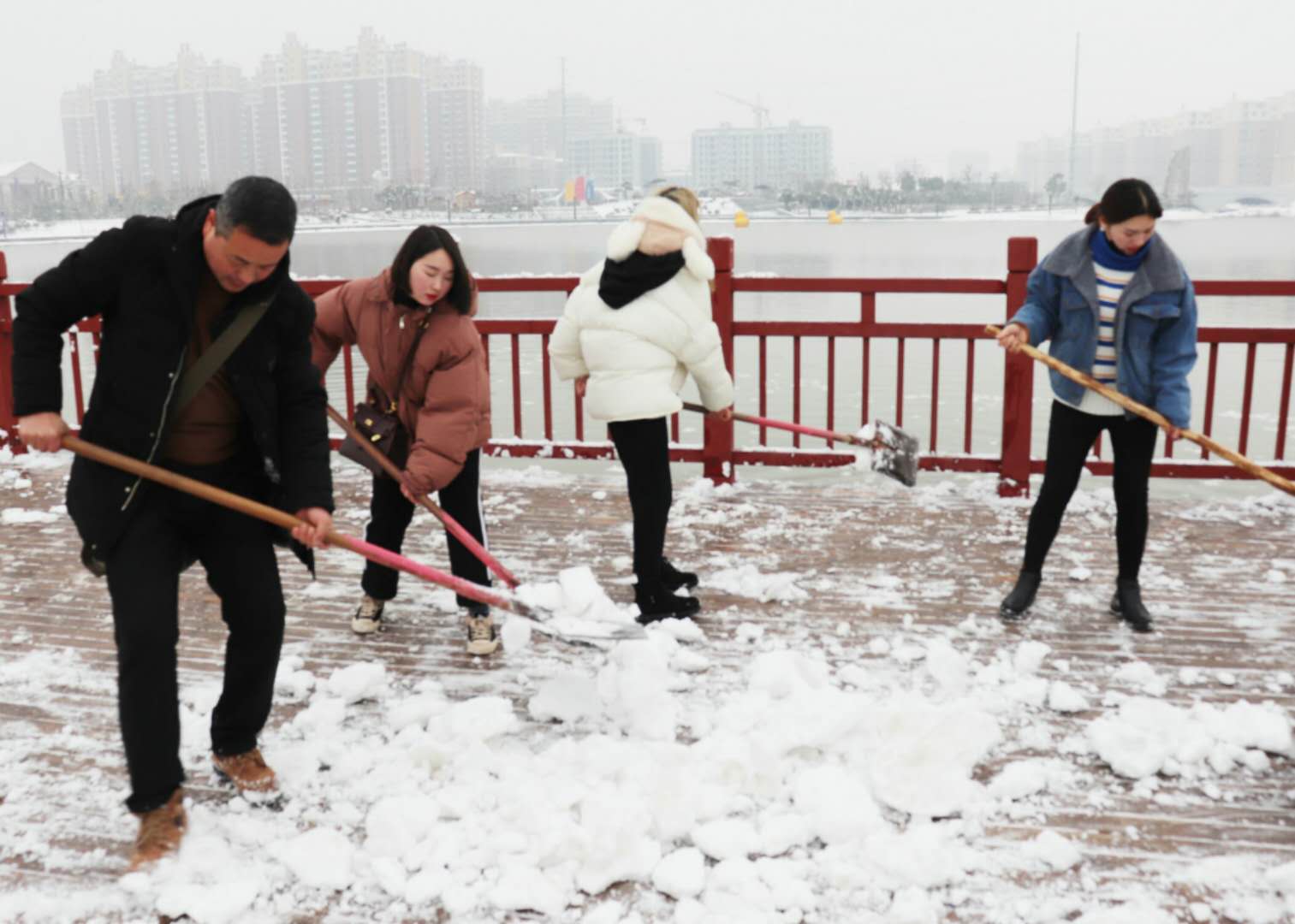 經(jīng)過兩場大雪的洗禮,空氣格外清新,但鹿邑上清湖公園內(nèi)積雪嚴重,且已結(jié)冰,給市民游園帶來了諸多不便和隱患。從早晨到下午4點半,鹿邑市政園林中心的干部職工和道德公益志愿者在上清湖集合后,投入鏟雪掃雪行動,經(jīng)過一天的緊張清掃,上清湖湖面棧道和園內(nèi)公路上的積雪清掃一遍。道德公益志愿者鐘華在微信群里提出建議后,有十幾位志愿者報名參加上清湖義務掃雪活動。