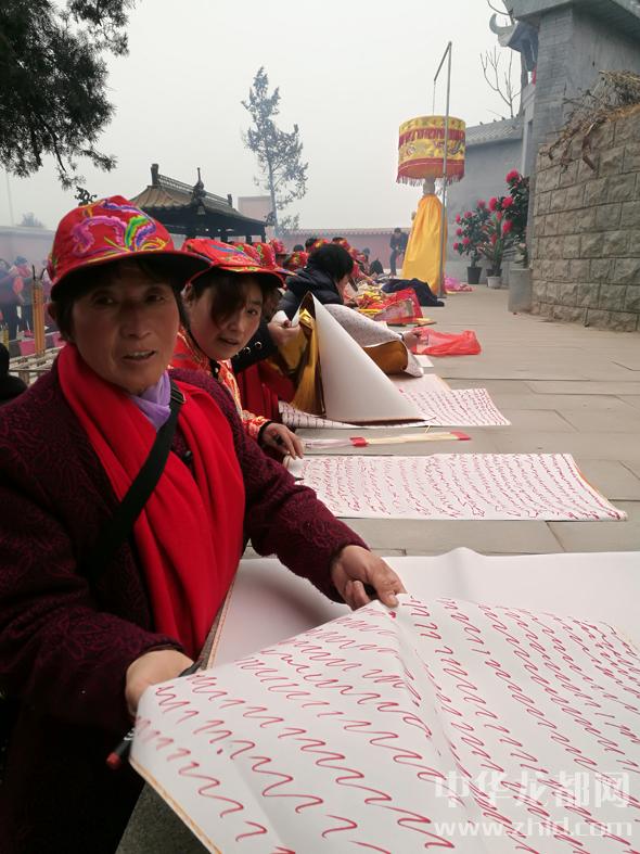 大霧的確延緩了香客的腳步,這也讓晚來的記者得以看到祭拜的盛景。女媧陵前,十幾名身著統(tǒng)一緞面紅襖,穿黑棉布鞋的女客正在結(jié)伴焚香祭拜,口音明顯和當(dāng)?shù)厝瞬煌?。她們是從距西華300多公里的濮陽范縣、臺前縣來的,說是凌晨2時就起身出發(fā),大霧中不僅遭遇堵車,還迷了路,到女媧城都快8時了。她們這次一起來的有30多人,分乘4輛車。就像往常前來一樣,她們在女媧城要焚香、跪拜、“寫賬”(在紙上畫符,敬奉女媧的一種民間形式)、“守功”(在大殿靜坐,以示對女媧親近),直至下午方回?!拔覀兠磕炅鲁跻缓团D月初一都來,為啥?信奉女媧娘娘唄,不來不舒服?!逼渲幸晃豢仔障憧透嬖V記者。