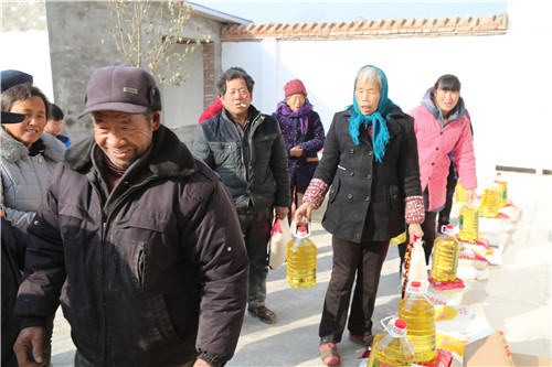 當(dāng)日上午,雖然天氣寒冷,可葉莊行政村村室院里卻暖意融融。該村村主任熊茂禮正在把備好的年貨發(fā)放到49戶村民的手中?!胺浅8兄x茂禮這么遠(yuǎn)回老家看望我們這些困難戶,讓我們過上一個(gè)好年?!爆F(xiàn)年76歲的村民張多朗是個(gè)五保戶,接過熊茂禮送上的年貨連聲道謝。熊茂禮鼓勵(lì)困難戶一定要對生活充滿信心,樂觀地面對生活。同時(shí),希望困難戶要保持良好心態(tài),積極面對困難,自強(qiáng)自立,早日擺脫困境。