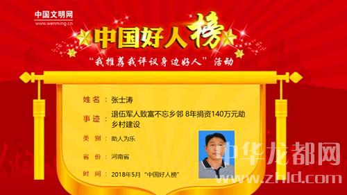 中華龍都網(wǎng)訊(周口報(bào)業(yè)全媒體記者 馬治衛(wèi))5月30日,中央文明辦、中國(guó)文明網(wǎng)正式發(fā)布了2018年“中國(guó)好人榜”5月榜單。我市太康籍張士濤榮登5月份“中國(guó)好人榜”。