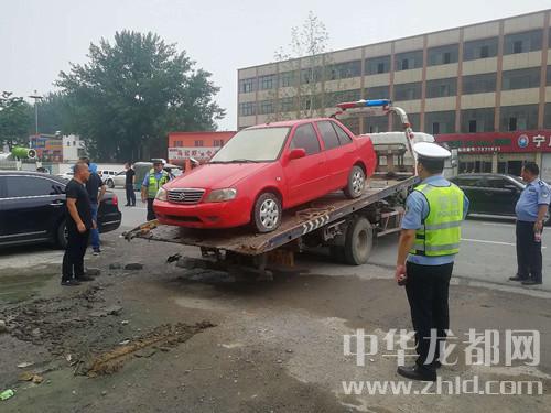 在市區(qū)七一路與建安路交叉口附近,有一輛銀色“僵尸車”,左前方的輪胎沒氣,車身有些傾斜?!斑@車停這已經(jīng)很久了,趕緊給它拖走吧?!敝苓吘用裾f。距離這里不遠處的大地華府附近,一輛紅色“僵尸車”趴在水窩里。隨著謝偉一聲令下,兩輛“僵尸車”被拖走。