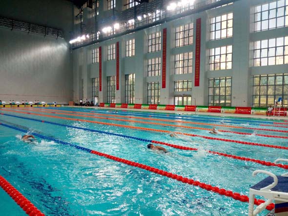 據(jù)了解,市游泳館占地面積4.4萬平方米,總建筑面積24398.69平方米,地上建筑面積20846.08平方米,地下建筑面積3552.61平方米,地上三層、地下一層,可容納觀眾1200人。市游泳館內(nèi)共有兩個大的泳池,一個比賽用,長50米、寬25米,規(guī)格達到奧運會游泳比賽泳池標準,比賽時水深將達到2米;另外一個練習(xí)用,供參賽選手熱身,水深1.2米。