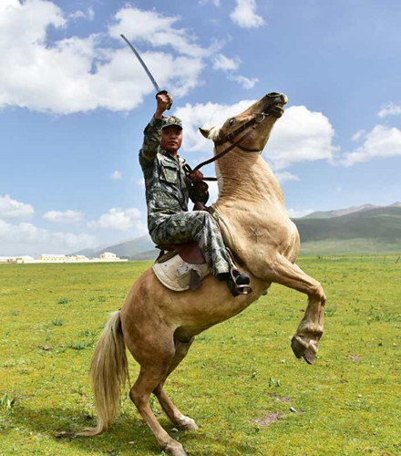 盛夏的巴塘草原,天藍(lán)草綠,戰(zhàn)馬嘶鳴。不遠(yuǎn)處的開(kāi)闊地上,豎著7個(gè)高低不同的靶標(biāo)。隨著連長(zhǎng)王育龍一聲令下,駕著“頭馬”的上士趙雪超高聲長(zhǎng)嘯揚(yáng)鞭策馬疾馳,他利落地拔出馬刀,左刺右劈,刀起靶落,一整套動(dòng)作一氣呵成,彪悍十足。近距離觀摩課目示范的騎兵連新兵一個(gè)個(gè)驚呼“開(kāi)了眼”,都說(shuō)從趙班長(zhǎng)身上看到了影視劇里蒙古鐵騎的影子。