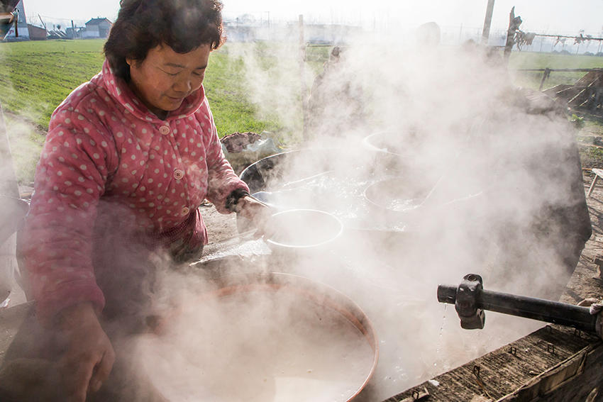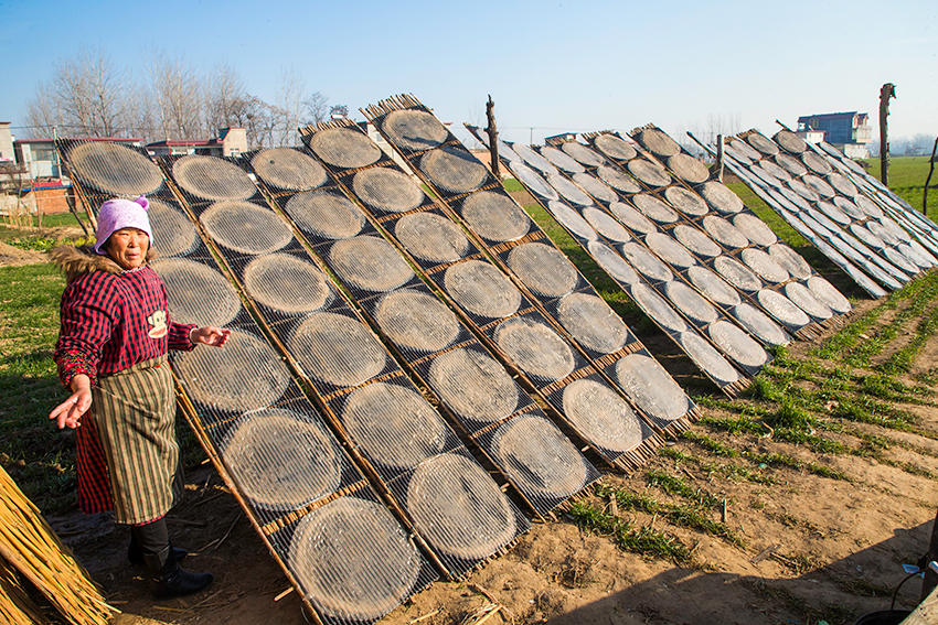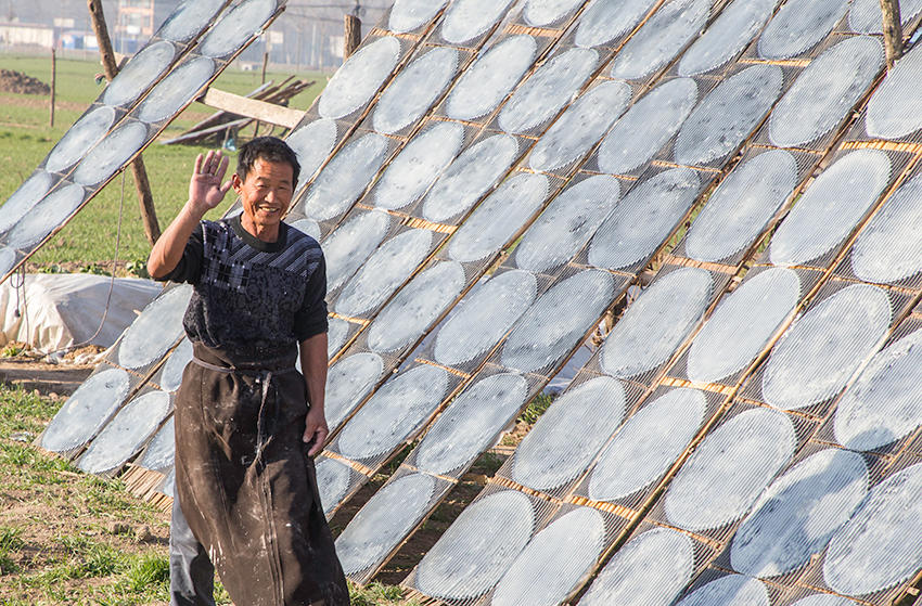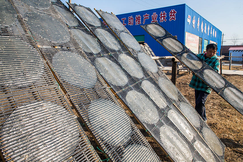 寒冬,河南省沈丘縣付井鎮(zhèn)楊莊村子里,一個(gè)個(gè)制作粉皮的工棚里爐火正旺,熱氣騰騰的大鍋里漂出一張張粉皮。田野中,到處是晾曬粉皮的場(chǎng)景,真是難得一見(jiàn)。