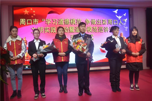 市公安局交警王凱偉是2018年敬業(yè)奉獻(xiàn)類中國好人,省五四獎?wù)芦@得者,經(jīng)常參加公益活動,持續(xù)幫助貧困女孩小夢麗和她家人,用善舉挽救了這個(gè)貧困家庭。扶溝縣曹里鄉(xiāng)刁灣小學(xué)教師李艷琴扎根鄉(xiāng)村教育一線無怨無悔,數(shù)年如一日照顧癱瘓?jiān)诖驳钠牌湃蝿谌卧?,曾獲縣最美鄉(xiāng)村老師稱號。鹿邑伯陽中學(xué)“90后”女教師劉交交剛參加完高考后父親因病去世,母親身患?xì)埣病K幌蛎\(yùn)低頭,靠打工收入和微薄的助學(xué)金維持生活和學(xué)業(yè),為照顧母親,她攜母上大學(xué),曾獲中國大學(xué)生自強(qiáng)之星等稱號,被授予省五四獎?wù)?。三位道德模范雖然都是最平凡的人,但都有一顆不平凡的心,他們的感人事跡散發(fā)著奪目的光芒,深深感染了現(xiàn)場的每一位聽眾,不少人流下了感動的淚水。