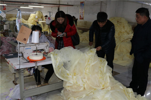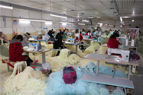 “對(duì)于有勞動(dòng)能力的貧困戶及留守婦女,只要報(bào)名一律錄用,根據(jù)個(gè)人能力提供合適崗位,免費(fèi)進(jìn)行業(yè)務(wù)技能培訓(xùn),變‘輸血’變‘造血’;成為熟練工的貧困戶,月收入均可達(dá)到3000元以上。”金凱盛家紡“扶貧車(chē)間”位于吳小廟村邊,該公司負(fù)責(zé)人趙開(kāi)軍是楊湖口鎮(zhèn)走出去打工、在事業(yè)有成后返鄉(xiāng)創(chuàng)業(yè)的一個(gè)普通80后,他的公司總部位于江蘇省南通市,像這樣的幾百人加工基地附近有二三家,加工的產(chǎn)品一般是通過(guò)天貓、京東等知名電商平臺(tái)在全國(guó)進(jìn)行銷(xiāo)售,實(shí)行網(wǎng)上實(shí)行統(tǒng)一下單、就近發(fā)貨,這幾個(gè)基地主要負(fù)責(zé)長(zhǎng)江以北市場(chǎng)銷(xiāo)售,公司去年年銷(xiāo)售額已突破5000萬(wàn)元,解決周邊村莊數(shù)千人在門(mén)口就業(yè),帶動(dòng)100多戶貧困戶脫貧。