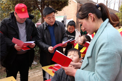 上午8時許,在新店鋪小學一棟教學樓前,前來參加活動的志愿者早已趕到,會場也已布置完畢。30多名身穿紅色馬甲的志愿者在會場中忙碌,排練節(jié)目、整理書包,向前去參加活動的村民和學生講解《志愿服務條例》和法律安全知識等。