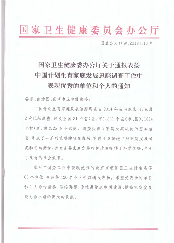 通知顯示,中國計(jì)劃生育家庭發(fā)展追蹤調(diào)查自2014年啟動(dòng)以來,已完成2次現(xiàn)場調(diào)查,涉及全國31個(gè)省(區(qū)、市)、321個(gè)縣(市、區(qū))、1624個(gè)村(居)的3.25萬個(gè)家庭。調(diào)查獲得了家庭及其成員的基本信息,形成了一系列重要的研究成果,有助于更好地了解家庭發(fā)展?fàn)顩r和變動(dòng)趨勢(shì),也為完善家庭發(fā)展相關(guān)政策提供了科學(xué)依據(jù),產(chǎn)生了良好的社會(huì)效果。國家衛(wèi)健委對(duì)在此項(xiàng)工作中表現(xiàn)優(yōu)秀的65個(gè)單位、420名個(gè)人進(jìn)行通報(bào)表揚(yáng),希望受表揚(yáng)的單位和個(gè)人珍惜榮譽(yù),再接再厲,為推進(jìn)健康中國建設(shè)、提高家庭發(fā)展能力作出新的更大的貢獻(xiàn)。