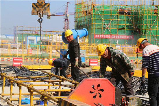 當(dāng)日上午,記者在施工現(xiàn)場看到,塔吊林立,機(jī)械轟鳴,運(yùn)輸車來來回回在現(xiàn)場穿梭,霧炮、噴淋設(shè)施配合作業(yè),工人們緊張有序的忙碌著,整個(gè)施工現(xiàn)場呈現(xiàn)出一派熱火朝天的景象。