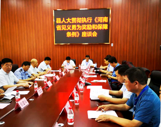 執(zhí)法檢查組召開座談會,聽取縣政府及相關(guān)部門關(guān)于貫徹實(shí)施《河南省見義勇為人員獎勵和保障條例》情況的匯報。部分市縣人大代表就貫徹執(zhí)行《條例》提出了一些意見和建議,檢查組對全縣落實(shí)《條例》情況給予充分肯定。