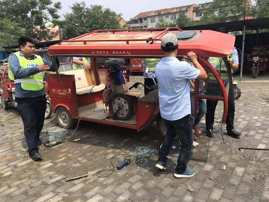 近日,鄲城縣城區(qū)道路交通秩序整治辦公室對(duì)半年來(lái)依法查扣的41輛非法營(yíng)運(yùn)三輪車(chē)進(jìn)行集中切割去頂,銷毀或變?yōu)槠胀矣萌嗆?chē)由車(chē)主領(lǐng)回,有效震懾了車(chē)輛非法營(yíng)運(yùn)行為,全面凈化了道路交通環(huán)境。
