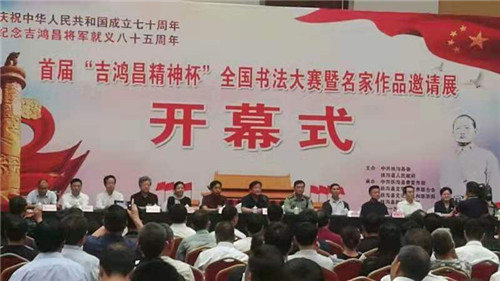 為紀(jì)念抗日民族英雄吉鴻昌將軍就義85周年,大力弘揚(yáng)愛國主義精神和中華民族優(yōu)秀傳統(tǒng)文化,9月28日上午,首屆“吉鴻昌精神杯”全國書法大賽暨名家作品邀請展在扶溝縣體育館隆重舉行。原廣州軍區(qū)政治部副主任陳大民少將、解放軍報社原副社長田仁德少將、解放軍報社原副總編孫臨平少將、解放軍裝備學(xué)院原副政委孫南京少將、解放軍總后勤部某研究所原所長楊廷欣少將、吉鴻昌將軍親屬鄭吉安大校,市委常委、周口軍分區(qū)政委孫先振,市政協(xié)副主席張文平,扶溝縣四個班子領(lǐng)導(dǎo)及副處級干部等出席開幕式??h委副書記、政法委書記詹凱主持儀式。