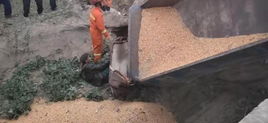 接警后,鄲城消防大隊(duì)立即出動3輛消防車15名指戰(zhàn)員前往處置。經(jīng)偵查發(fā)現(xiàn),側(cè)翻車輛是一輛農(nóng)用三輪車,車上拉有約2噸散裝玉米。現(xiàn)場玉米灑落一地,駕駛員約六十歲,左腿被農(nóng)用三輪車前輪壓住,無法脫身,加之即將天黑,當(dāng)時天氣較冷,如不及時處置,后果不堪設(shè)想。