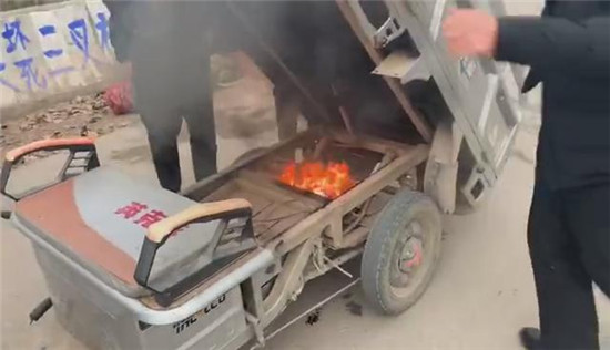 淮陽:三輪車突然短路起火 消防隊(duì)員手捧泥土滅火