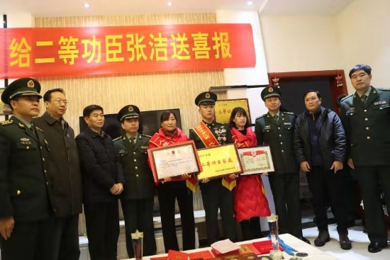 當(dāng)日上午,張潔的老家鑼鼓喧天,熱鬧非常。軍地領(lǐng)導(dǎo)在鄉(xiāng)親們熱烈地掌聲和鑼鼓聲中,帶著滿滿地祝福,專程趕到張潔家中?!皬垵嵧荆趪?guó)際軍事比武競(jìng)賽中取得第一名,榮立二等功為此特向您報(bào)喜。希望您今后多與部隊(duì)聯(lián)系,多給予張潔同志鼓勵(lì),為實(shí)現(xiàn)中華民族偉大復(fù)興的強(qiáng)國(guó)夢(mèng)、強(qiáng)軍夢(mèng)共同奮斗?!痹趶垵嵓抑?,69246部隊(duì)副政委楊富鵬代表組織宣讀了部隊(duì)賀信。