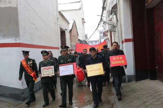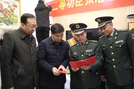 隨后,周口軍分區(qū)政治部主任李揚(yáng),太康縣委副書記、政法委書記劉海艇,縣委常委、副縣長(zhǎng)韓維俊,縣委常委、人武部部長(zhǎng)于永前,人武部政委郭立君等領(lǐng)導(dǎo)給張潔的母親盧靈芝送去了立功喜報(bào)、二等功臣家庭牌匾和慰問品、慰問金。