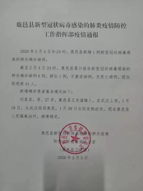 截至2月4日24時,鹿邑縣累計報告新型冠狀病毒感染的肺炎確診病例6例,疑似1例,無重癥病例,無死亡病例,現(xiàn)住院觀察41人。