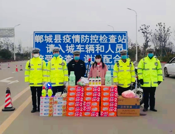 2月6日下午,周口市格林生活廣場總經理于云帶著消毒液、噴壺、火腿腸、方便面等慰問物資,來到鄲城縣文昌大道與迎賓大道交叉口疫情防控檢查卡點,看望慰問值勤的公安民警。