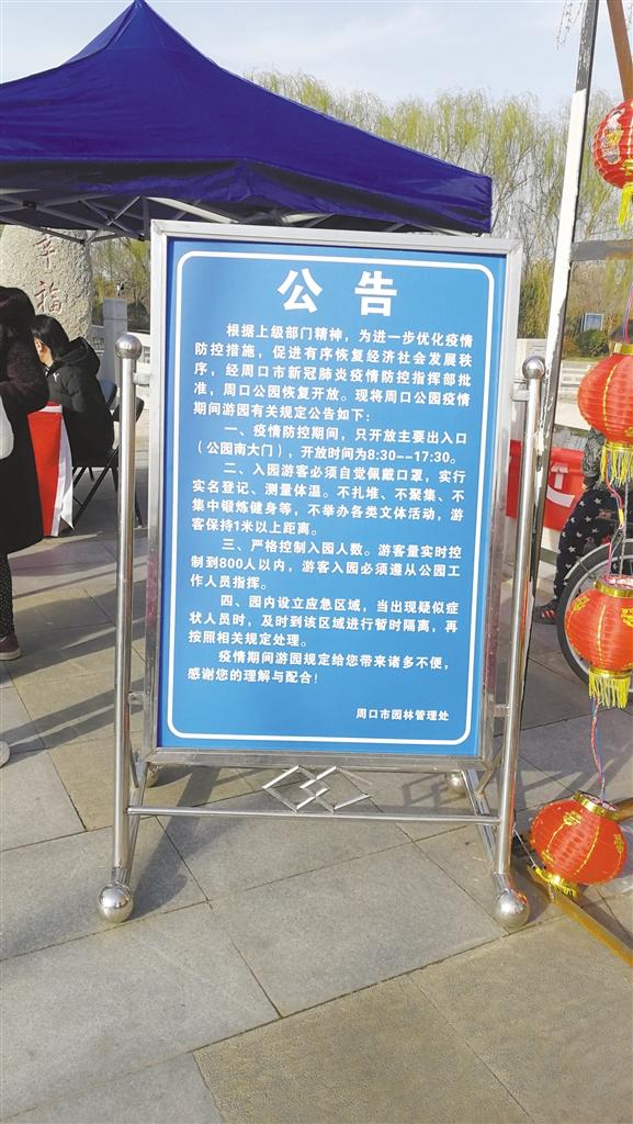 當(dāng)日上午10時(shí)許,記者在周口公園看到,在南門入口處的醒目位置,擺放著一個(gè)公告牌,寫有入園須知,上面顯示疫情防控期間的開園時(shí)間為8:30~17:30,不少游客駐足觀看。入口處,周口市園林管理處疫情防控宣傳臺前的工作人員正忙碌著。游客需間隔1米距離排隊(duì),經(jīng)測量體溫、登記身份證號、雙手噴灑酒精后方可進(jìn)園。雖然入園程序有點(diǎn)繁瑣,但是游客都非常配合。