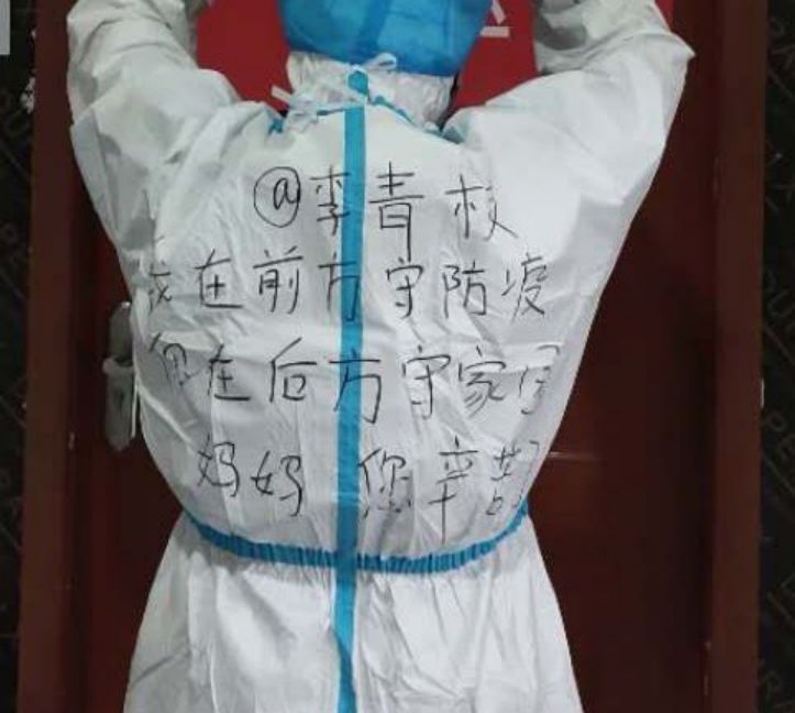 “我在前方守疫,你在后方守家園”,李慧在防護服上寫下感謝媽媽的話,心疼婆婆幫忙照顧孩子。