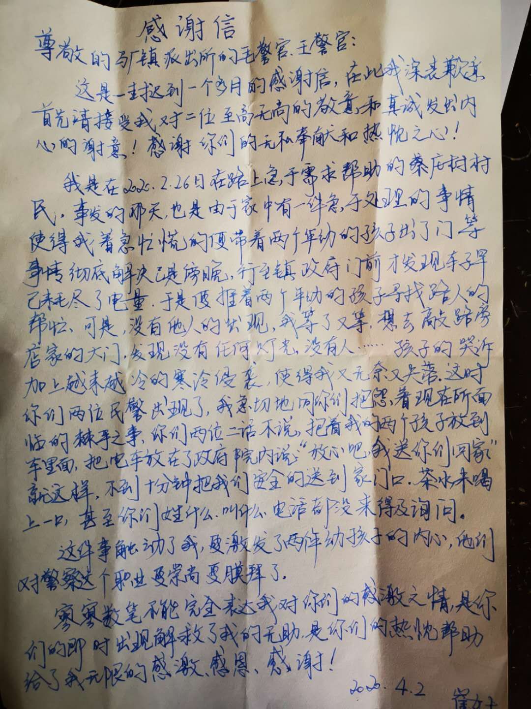 從聊天中得知,該女士姓崔,家距離衛(wèi)生院較遠而且家里有兩名老人,她的丈夫又在外地。看完病,派出所所長毛衛(wèi)庚指示巡警民警把崔女士和孩子們安全護送到家。后來,崔女士家人多次聯(lián)系毛衛(wèi)庚說要表示感謝,都被民警們謝絕。