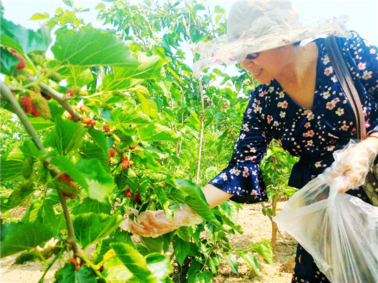 眼下正是桑葚陸續(xù)成熱的好時(shí)節(jié)。黃泛區(qū)農(nóng)場(chǎng)郭莊村鷹虎寶百畝桑椹園,一排排桑樹(shù)枝頭上,掛滿(mǎn)了或青或紅或紫的桑葚。紫黑桑葚放入口中,輕輕一咬,甜甜酸酸的味道瞬間在口中蔓延開(kāi)來(lái),讓人忍不住想多嘗幾顆。