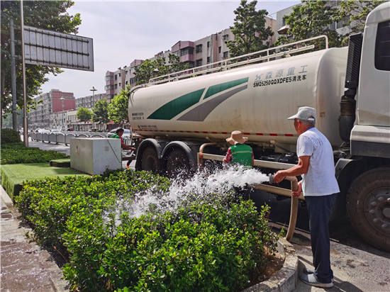 6月4日,園林工人在市區(qū)七一路為綠化帶內(nèi)植被澆水“解渴”。近期我市持續(xù)高溫天氣,為應(yīng)對(duì)連續(xù)高溫,綠化部門(mén)加大對(duì)綠化樹(shù)木的澆灌灑水頻次,為城區(qū)的花草樹(shù)木“消暑”, 確保綠化植物的存活率。