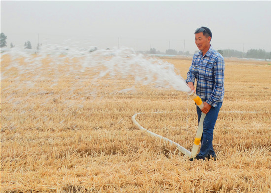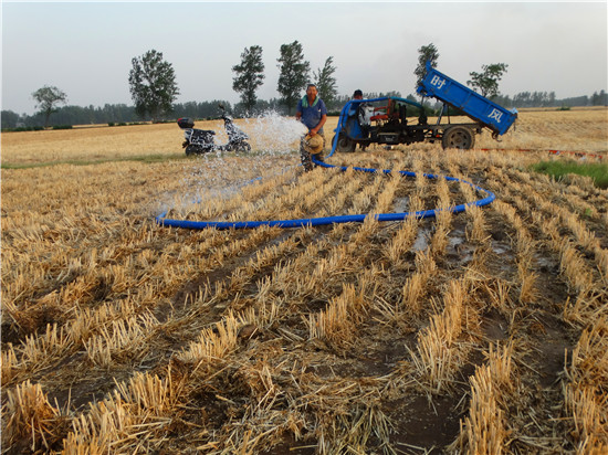 6月6日,沈丘縣周營(yíng)鎮(zhèn)農(nóng)民正忙著抗旱“造墑”、“補(bǔ)墑”澆水,期待奪取秋糧豐收。 近期來,由于連續(xù)多日高溫?zé)o雨,土壤墑情差,無法播種秋作物。針對(duì)當(dāng)下嚴(yán)重的旱情,沈丘縣掀起“雙抗旱”(抗旱保苗、抗旱種秋)高潮。目前,該縣日出動(dòng)勞力1.8萬余人,出動(dòng)各類噴灌機(jī)械26000多臺(tái)(套),力保農(nóng)田播種的玉米出苗。