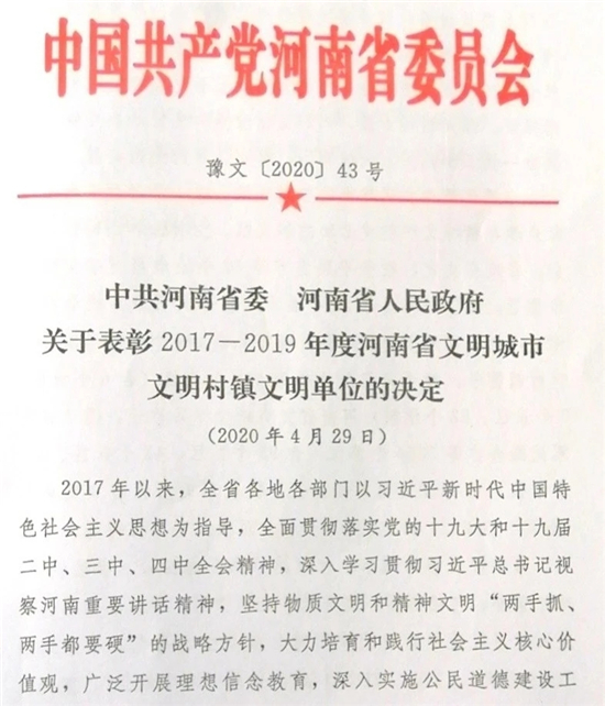 近日,省委、省政府下發(fā)《關(guān)于表彰2017—2019年度河南省文明城市文明村鎮(zhèn)文明單位的決定》(豫文〔2020〕43號(hào)),鄲城縣婦幼保健院名列其中,榮獲“河南省文明單位”榮譽(yù)稱號(hào)。這是我院自1987年首次被授予“河南省文明單位”稱號(hào)以來(lái),連續(xù)第33年保持這項(xiàng)榮譽(yù)。
