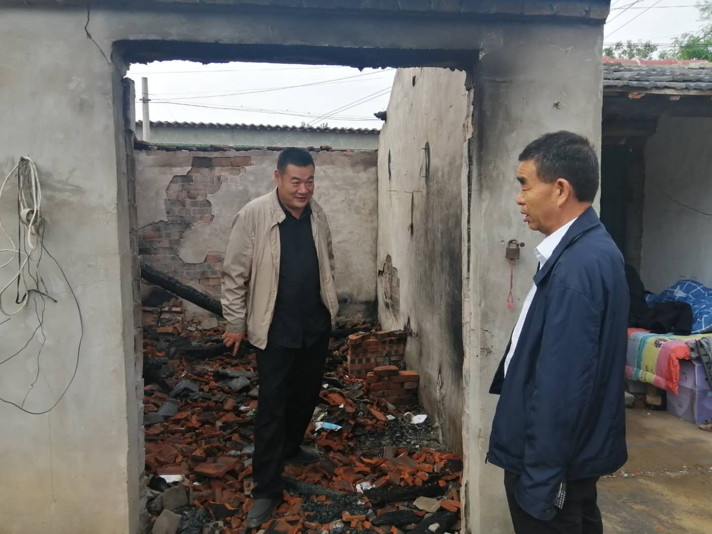 聽完情況后,督導(dǎo)組立刻和駐村工作人員一起到李洪范家查看情況,現(xiàn)場主屋已經(jīng)全部燒毀,屋里到處是瓦礫......李洪范站在被燒毀的房屋里,表情木納的自言自語道“燒得一干二凈,什么都沒了,這以后咋弄呀?!爆F(xiàn)場詢問其生活情況時,李洪范說,“當(dāng)天,鄉(xiāng)里邊就送來了米、油和錢。村長也送來了幾件衣服,現(xiàn)在就是沒有地方住?!?/p>