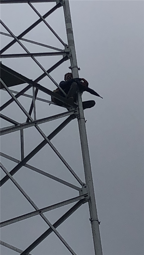 6月18日上午8時(shí)19分,付井鎮(zhèn)派出所值班民警趙良,韓高峰接到報(bào)警電話,一名山東省滕州籍男子因?yàn)楦星槊茉谳爡^(qū)高鐵附近一信號(hào)塔上準(zhǔn)備自殺。值班民警向所長陳劍鵬匯報(bào)后,陳劍鵬立即帶領(lǐng)民警霍玉亮、韓高峰以及輔警楊國強(qiáng)、孫海紅、王初中、范紅偉等人迅速趕到現(xiàn)場。