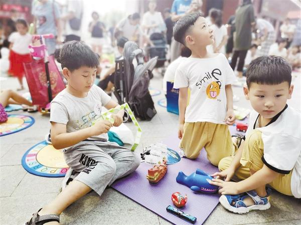 記者在現(xiàn)場看到,小朋友拉起了橫幅,擺上了玩具,搖身一變“小掌柜”,紛紛拉貨練攤、討價(jià)還價(jià)、吆喝售賣。
