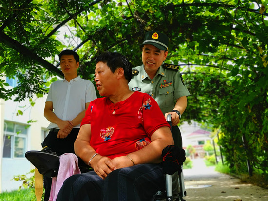 走進位于太昊路上的周口市老年護理院,院內(nèi)整潔有序、花蕊吐香鳥鳴聲聲,小徑通幽處的涼亭內(nèi)三五老人打牌、聊天,一副愜意安詳?shù)纳顖鼍?。在侯國領母親王玉勤居住的房間內(nèi),李揚、孫光濤等人坐在床邊與她聊天談心,看到這么多人來慰問她,王玉勤眼中流下了感動的眼淚,她對慰問人員表示感謝,說自己來護理院近一年來,吃住條件都不錯,護理院照顧的無微不至,身體一天天恢復,閑暇時還能不依賴輪椅自己走上一段路。她激動地說:“感謝黨和政府的親切關懷,我最大的愿望是希望倆兒子永遠聽黨的話,在部隊安心服役、再立新功,用優(yōu)異的成績回報黨和政府對我們?nèi)业年P愛?!?/p>
