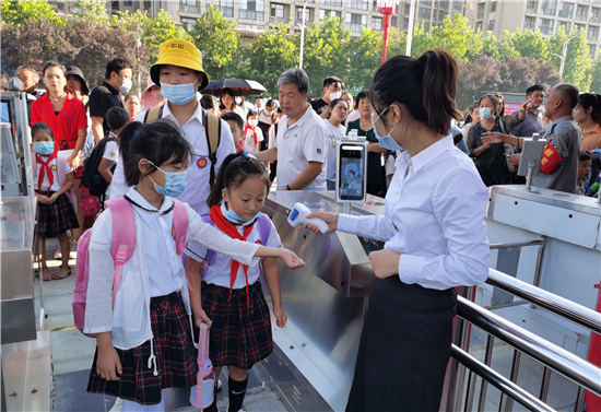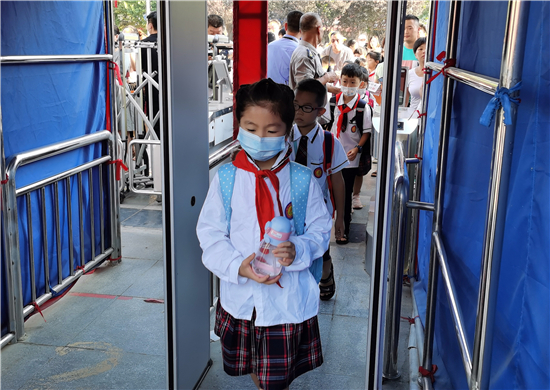 9月7日早上,周口市文昌小學(xué)的學(xué)生有序排隊(duì)測(cè)量體溫后進(jìn)入學(xué)校。據(jù)文昌小學(xué)校長(zhǎng)介紹,全市中小學(xué)實(shí)行錯(cuò)峰開(kāi)學(xué)。今天是小學(xué)開(kāi)學(xué)時(shí)間,文昌小學(xué)學(xué)生每個(gè)年級(jí)實(shí)行錯(cuò)時(shí)上下學(xué),學(xué)生入校要測(cè)體溫,并為一年級(jí)新生舉辦了主題為“夢(mèng)從這里啟航”的“迎新儀式”。