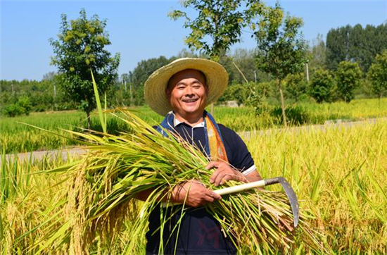 光山縣文殊鄉(xiāng)東岳村,四方景家庭農(nóng)場(chǎng)黨支部書(shū)記楊長(zhǎng)太家的稻子喜獲豐收,并給我們?cè)V說(shuō)著村里這一年的新變化。劉宏冰 攝